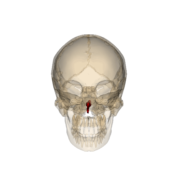 one of the unpaired facial bones of the skull. It is located in the midsagittal line, and articulates with the sphenoid, the ethmoid, the left and right palatine bones, and the left and right maxillary bones. The vomer forms the inferior part of the nasal septum in humans, with the superior part formed by the perpendicular plate of the ethmoid bone.